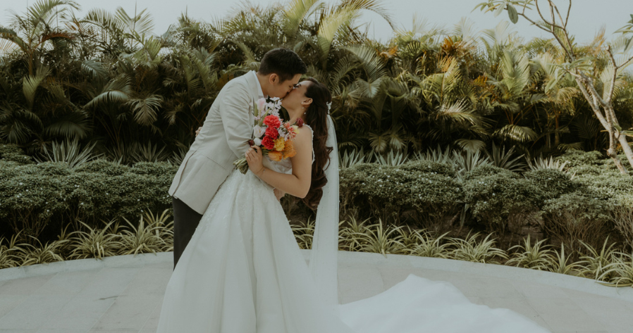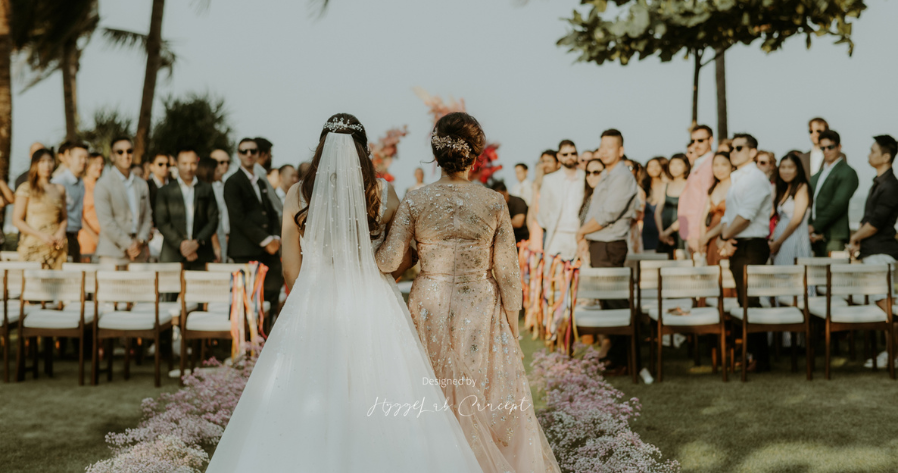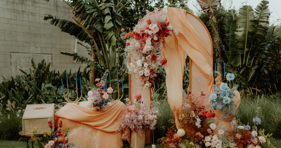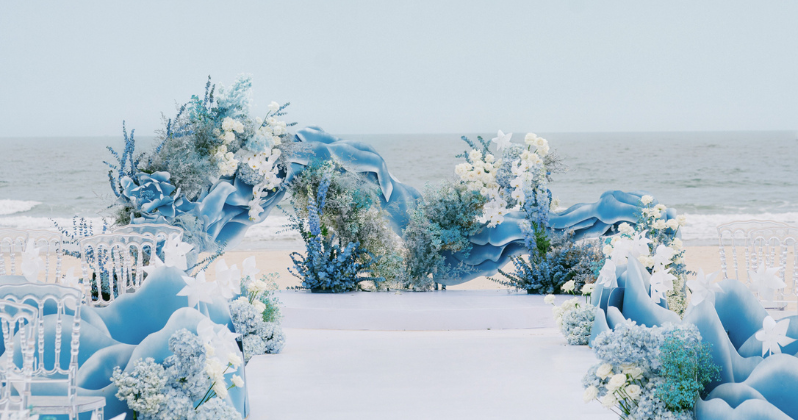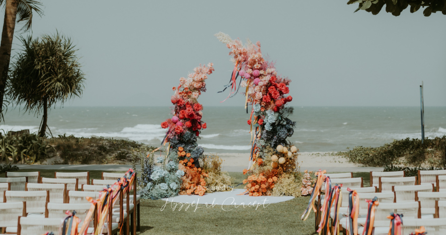 HyggeLab đã hô biến tiệc cưới của Jac và Andy thành không gian ngoài trời đẹp mơ màng bên bờ biển. Điểm nhấn là sự chuyển màu tinh tế của cổng hoa từ xanh dương đến cam, hồng và đỏ thẫm của nhiều loại hoa tươi kết hợp cùng dây ruy băng bay bổng trong gió.